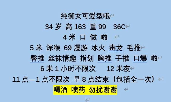 这个小姐姐服务很好,进门会漏出甜甜的笑容看着你,然后上手抚摸你的jj,口角一级棒,还有那大屁股,后入很得劲,不会催你的,联系就是她本人号。
